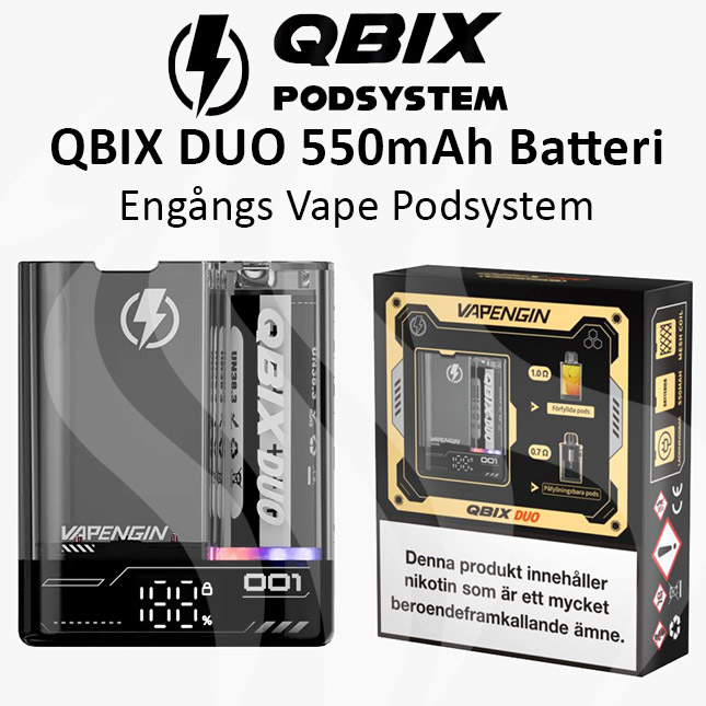 Nya QBIX Podsystem Batteri Duo 550mAh är ett laddningsbart baspaket med batteri som passar till Qbix poddarna. Det är utrustat med en ny design och färgdisplay som visar batterinivån samt ett smart barnlås. Systemet använder utbytbara kapslar som räcker upp till cirka 600 puffar per kapsel. Batteriet är kompakt, snabbt att ladda och enkelt att hantera, vilket gör det smidigt att använda i vardagen.